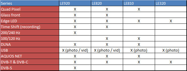 De LE820 is een stap lager dan de LE920 en zal beschikbaar zijn in grootten tot aan 60 inch. Verder maakt de LE820 gebruik van Aquos Net en een ‘Glass Design’.