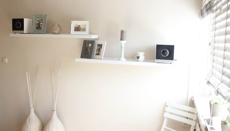 Voor de woonkamer wilden we een boven gemiddeld goede kwaliteit, met een volledig bereik, aardig wat volume en een strak design. Hierdoor zijn we terechtgekomen bij de Raumfeld Stereo L, een staande vloerluidspreker met een zwarte grill en een hoogglans wit uiterlijk. Voor de slaapkamer, waar we een stereogeluid uit twee strakke speakers wilden, kwamen we op de Raumfeld Stereo Cubes terecht. De tuin hebben we voorzien van de spatwaterbestendige Raumfeld One S, terwijl de werkkamer de compacte maar kwalitatief hoogwaardige Raumfeld One M heeft gekregen. Alle speakers zijn in een witte uitvoering aangeschaft waardoor ze in het interieur passen en samen ook één geheel vormen. Op zolder is overigens de Raumfeld Connector geplaatst. Dit kleine apparaatje kan eenvoudig verstopt worden en verbindt puur de bestaande receiver met het multiroom-systeem waardoor je ook daar de muziek vanuit de app (of de line-in ingang) kunt afspelen.