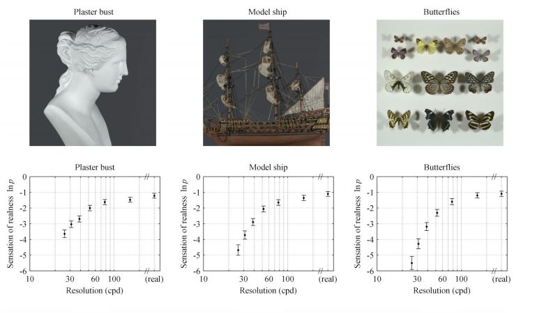 Het onderzoek wees uit dat voor de drie testbeelden het gevoel van echtheid duidelijk toeneemt wanneer de resolutie van 30 naar 60 cpd stijgt, maar de meerwaarde van nog hogere resoluties was kleiner. Die resultaten waren overigens onafhankelijk van het scherptezicht van de kandidaten. De conclusie stelt dat 60 cpd noodzakelijk lijkt te zijn voor een gevoel van echtheid.
