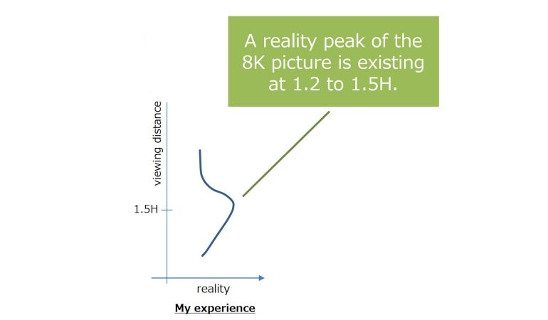 Maar Toshiyuki Ogura, Chief Distinguished Engineer bij Sony Visual Products, kwam tijdens experimenten tot een ander inzicht. Dicht bij het scherm zitten onthulde inderdaad gedetailleerde pixelinformatie. Maar wanneer hij verder van het scherm ging zitten werd het beeld ‘realistischer’. Voor een 8K beeld leek de piek van ‘realisme’ zich ergens te bevinden tussen 1,2 en 1,5 schermhoogtes.