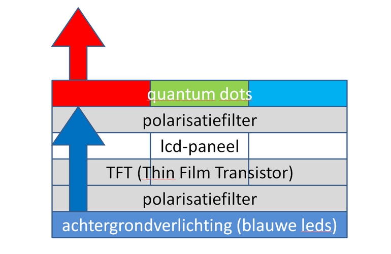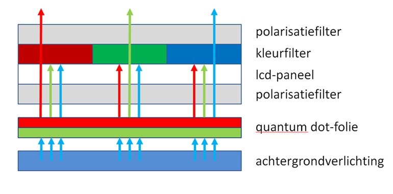 - Een lcd werkt op basis van twee gekruiste polarisatoren. Vermits quantum dots ongepolariseerd licht creëren, moet de quantum dot-laag boven de tweede polarisator komen in plaats van eronder zoals dat nu het geval is. De tweede polarisator moet dan in de lcd-cellen komen. Dit is een noodzakelijke technologie.
