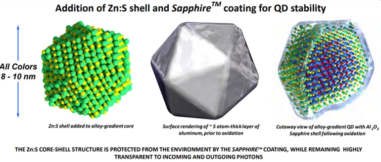 Alhoewel heel wat bedrijven aan dit probleem werken, is er voorlopig nog niet veel bekend. Crystalplex heeft een oplossing voor het coaten van elke quantum dot in een aluminiumoxide (saffier)laagje. Pacific Light Technologies en Lumileds hebben een oplossing, maar die is nog niet commercieel beschikbaar.