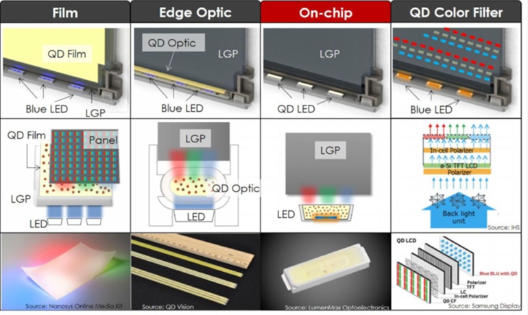QD-film: dit wordt door alle huidige tv-modellen gebruikt. De quantum dots worden in een film aangebracht die op de Light Guide Plate (LGP) ligt. De film moet de quantum dots perfect beschermen tegen de atmosfeer. De oplossing is erg makkelijk te integreren in het display, maar gebruikt veel quantum dot-materiaal en heeft een hoge prijs. De film is bovendien vrij dik, wat gebruik in mobiele toepassingen hindert.