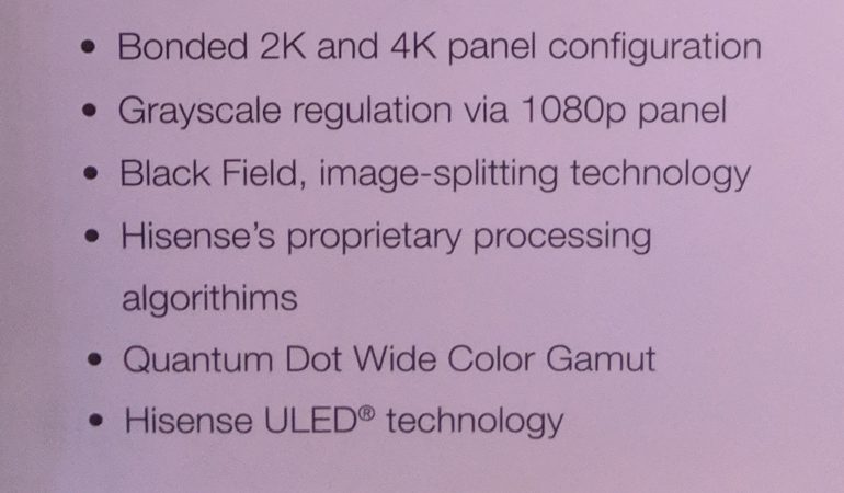 Het Chinese Hisense is voorlopig nog geen grote naam in de lage landen, maar wel een speler om in de gaten te houden. Op CES toonden ze een prototype van een lcd-technologie met zeer hoog contrast. Het concept is vrij eenvoudig. Door twee lcd-panelen achter elkaar te plaatsen kan je het contrast theoretische zeer sterk verhogen (twee panelen met contrast van 1.000:1 geven een theoretisch eindresultaat van 1.000.000:1).