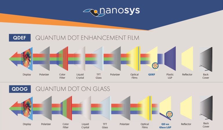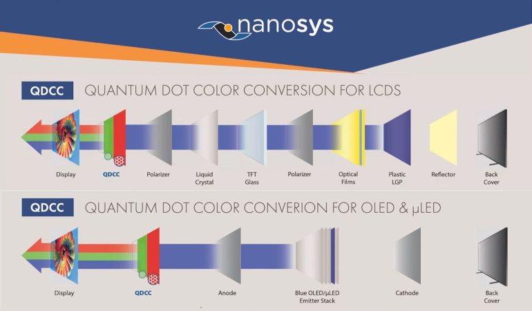 We zagen dat concept eind 2016 aangekondigd voor een lcd-scherm, maar daarvoor moest de polarisator in de LCD-cel geplaatst worden (zie QDCF hier). Dat bleek echter moeilijker dan verwacht, de contrastratio van zo een lcd-paneel is dan te laag. Die technologie blijft voorlopig in research fase. Maar het concept en de Nanosys materialen hebben hergebruik gevonden in combinatie met andere schermtechnologie, namelijk microled en oled.