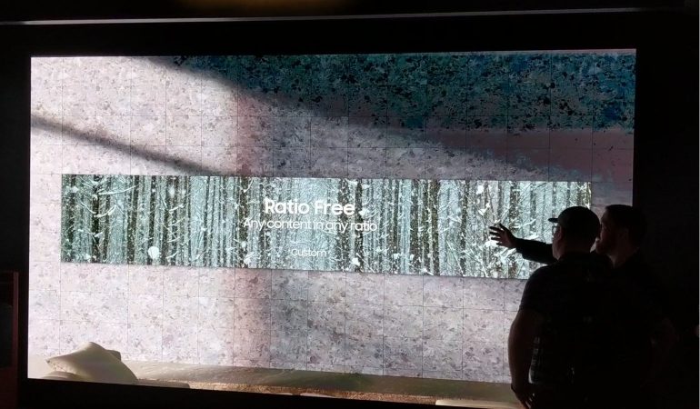 Samsung pakte uit met een nieuwe versie van ‘The Wall’. Vorig jaar toonden ze een 146 inch versie, dit jaar ging het over een 219 inch kolos met 2.000 nits lichtopbrengst. Het scherm heeft geen bezel, geen vaste grootte, geen vaste resolutie noch beeldverhouding. Je kunt content dus tonen op eender welke manier.