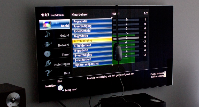 - Vervolgens wordt de kleurendriehoek erbij gehaald. Dit is een spectrum van kleuren waardoor een lijn loopt die de tv zo dicht mogelijk moet volgen. De kalibrator gaat aan de slag met onder meer de helderheid, de verzadiging en de tint van de primaire en secundaire kleuren om die natuurgetrouwe weergave te bereiken. Deze kleurafstelling duurt het langst maar is wellicht het meest belangrijke onderdeel van de kalibratie.