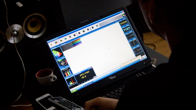 - De sensor wordt op je tv geplaatst en verbonden met de laptop van de kalibrator. De speciale Blu-ray disc met testpatronen wordt afgespeeld en de kalibratie gaat van start.