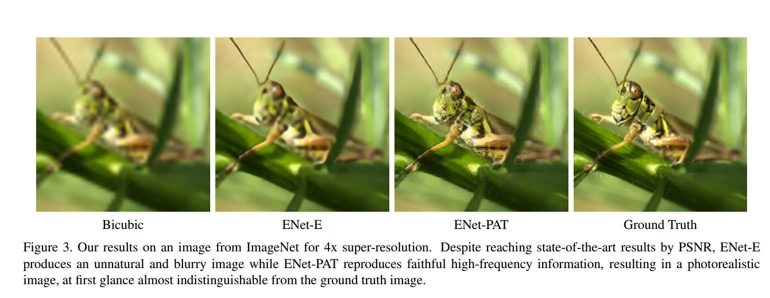 Rechts het origineel (ground truth), en dan van links naar rechts: een basisvoorbeeld van bicubische upscaling, een versie van het voorgestelde algoritme zonder textuur synthese (ENet-E), en een versie met textuur synthese (ENet-PAT).
