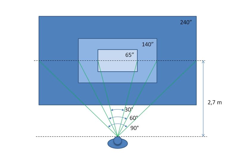 Dat laatste is al groter dan wat in heel wat woonkamers mogelijk zal zijn. Willen we nog verder gaan, en 90° blikveld vullen, dan mag je niet verder zitten dan 0,4 keer de schermdiagonaal. Dat is een 240 inch beeldscherm op die typische kijkafstand van 2,7 meter. Dat is 5,3 meter breed en drie meter hoog! Het mag duidelijk zijn dat dergelijke ‘belevenis’ niet snel naar de woonkamer zal komen.