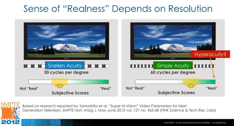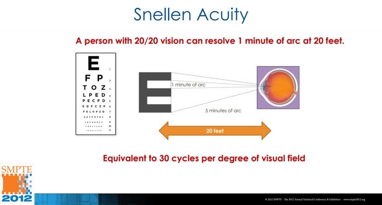 Maar die 20/20 richtlijn is een arbitraire grens, we noemen het ook de Snellen Acuity naar de Snellen oogarts test. Verder onderzoek toont echter aan dat we in het centrum van ons oog tot 150 pixels/graad kunnen waarnemen of meer (hier, en hier voor wie research wil), dat is de zogenaamde ‘simple acuity’, gebaseerd op het aantal fotoreceptoren in het oog. En bij andere taken, waar ons brein de visuele waarneming assisteert, is ons zicht nog scherper, bijvoorbeeld als we moeten vaststellen of twee lijnen uitgelijnd zijn (Vernier acuity) of punten op een lijn staan, of lijnen al dan niet recht staan, enzovoort. Dit noemen we over het algemeen ‘Hyperacuity’ (hyper gezichtsscherpte, hier voor meer info). Een belangrijke reden om hiermee rekening te houden is het feit dat beeldartefacten (van compressie, ruis, moiré, deinterlacing enzovoort) juist veel scherper waar te nemen zijn, net omdat we weten dat het beeld ‘niet klopt’. Als we beoordelen of een beeld ‘echt’ aanvoelt, moeten we dus rekening houden met een hoger scherptezicht. De SMPTE gaat daarom uit van een scherptezicht van 120 pixels per graad.
