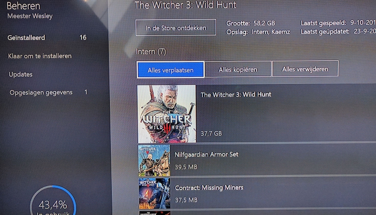 Het ligt aan de game hoe lang het verplaatsen of kopiëren duurt. Zijn het kleine titels, dan zal het waarschijnlijk een paar minuten duren. Wil je een game als Witcher 3: Wild Hunt verplaatsen, dan kan dat wel een uur duren. Wil je meerdere games verplaatsen of kopiëren, dan kun je een lijn vormen, zodat de Xbox One de games automatisch zal verplaatsen. Je dient wel zelf per game handmatig aan te geven welke je precies op de externe harde schijf wil zetten. Helaas is er geen optie om meerdere spellen tegelijkertijd te selecteren en te verplaatsen.