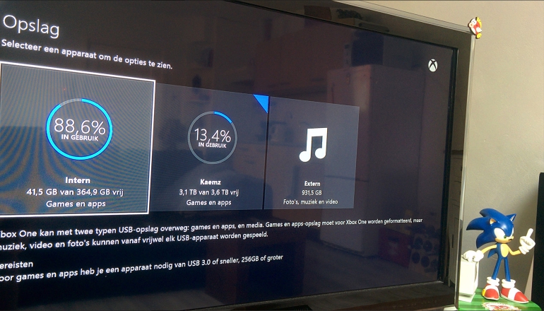 De externe harde schijf moet USB 3.0 ondersteunen. Heb je nog ergens een oude harde schijf liggen die dat niet doet, dan heb je er helaas niets aan in combinatie met een Xbox One. De kans is dus groot dat je een nieuwe schijf moet kopen. Zelf heb ik er meteen maar één van 4TB gekocht, zodat ik er voorlopig geen omkijken meer naar heb. De Xbox One heeft geen limiet op het aantal terabytes dat het kan lezen, maar je kunt niet meer dan drie externe schijven tegelijkertijd aansluiten. Wel is er een minimum van tenminste 256GB.
