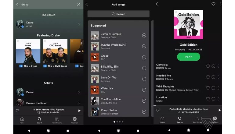 Nu is het nog zo dat gratis gebruikers alleen afspeellijsten in shuffle kunnen afspelen, dus daar is al een groot verschil te zien. Ook zijn alle pagina’s van een nieuwe lik verf voorzien. Het afspeelscherm toont artwork van de afspeellijst, de zoekpagina toont kleurrijke vierkanten met suggesties en er wordt laten zien welke je nummers je mag verwachten in een afspeellijst. De browseknop is nu te vinden binnen de zoekfunctie, terwijl de radioknop helemaal verdwenen. Verder is er een knopje voor Premium ingebouwd.