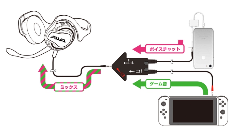 Zoals je wellicht kunt opmaken uit de bovenstaande afbeelding, dien je ook een klein netwerk aan kabels aan te leggen. Zo moet er een audiokabel van de Nintendo Switch naar het koppelstukje gaan. Ook moet er een kabel van de smartphone, waar de chatapplicatie op staat, naar dat tussenstuk gelegd worden. Vervolgens sluit je de headset op de koppeling aan en kun je toch echt beginnen. Het voordeel van deze constructie is dat je de audiochat en de game-audio los van elkaar kunt instellen qua volume.
