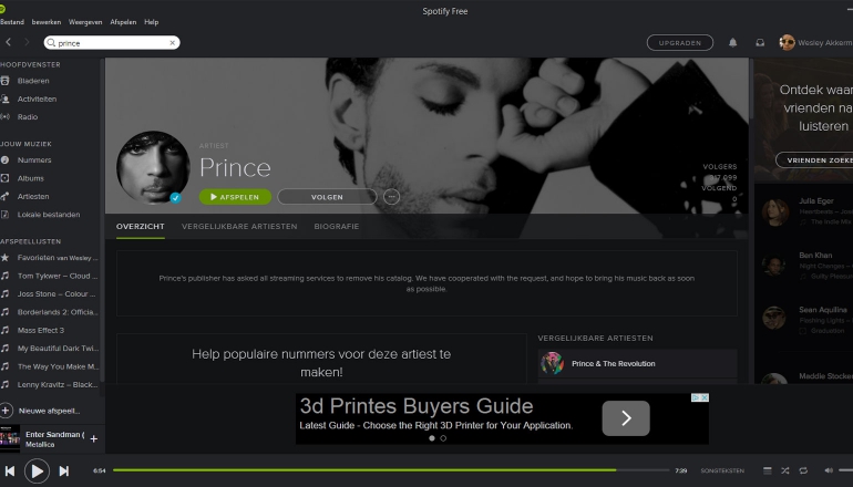 Prince geeft en Prince neemt: op dezelfde dag dat de zanger van het populair nummer Purple Rain een nieuwe track deelde met zijn fans via Soundcloud, het nummer HARDROCKLOVER, haalde de zanger ook zijn muziek weg bij verschillende muziekstreamingdiensten. Zo is de muziek van Prince niet meer terug te vinden op Spotify. Wanneer je de artiest opzoekt, dan vind je er de volgende tekst.