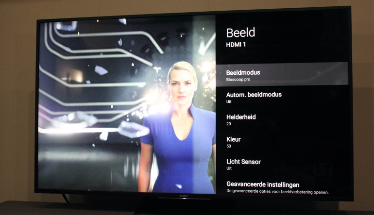 De modus Bioscoop Pro is vanuit de doos de beste modus om mee te beginnen. Deze modus biedt een vrij goed gekalibreerd scherm voor kijken in een donkere omgeving, en met een paar kleine aanpassingen krijg je een zeer goede beeldkwaliteit voorgeschoteld. Voor standaard dynamic range content zetten we de achtergrondverlichting niet te hoog, om zo nadelige effecten in donkere delen van het scherm te voorkomen. Bovendien kijkt het ook gewoon wat comfortabeler wanneer het scherm niet teveel licht geeft. De ruisreductiefilters voor het verwijderen van ruis e.d. zetten we uit, maar dit kun je bij content van mindere kwaliteit altijd activeren. Sony’s Auto local dimming-functie werkt vrij goed en met een Midden-instelling krijg je een hoog contrast terwijl ook diep zwart gewaarborgd blijft. Bij HDR-content kan deze optie vol openstaan om de maximale helderheid uit het paneel te halen. Daarbij hebben we de optie Motionflow op ‘True Cinema’ gezet. Deze instelling zorgt bij filmmateriaal voor een strakke en vloeiende weergave zonder dat je het gevoel hebt een homevideo te kijken. Je kunt echter zelf met deze instellingen spelen om de voor jou meest soepele en vloeiende weergave te realiseren. Ook Realiteits Creation is het noemen nog waard. Deze optie kijkt naar een database en zorgt er daarmee voor dat beelden wat scherper en gedetailleerden lijken. Het werkt hier en daar mooi, maar vooral met statische beelden. Je kunt zelf even experimenteren met de optie maar voor films in hoge kwaliteit zetten we het, ondanks dat het redelijk goed werkt, liever af. de reden hiervoor is dat het beeld er soms iets te bewerkt uitziet. Meer over de HDR-instellingen vind je verderop in de review.