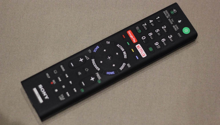 Sony levert één afstandsbediening mee met de KD-65ZD9, en het is een vrij normale afstandsbediening zonder toeters en bellen. De achterzijde is voorzien van een geborsteld metalen afwerking waardoor de afstandsbediening lekker in de hand ligt. De bovenzijde is echter voorzien van één stuk rubber, met ingebouwde toetsen die een zeer kleine travel hebben. Aan de travel kunnen we wennen maar het rubberen materiaal zorgt ervoor dat de accessoire snel vies en stoffig wordt. Alles blijft er op plakken, maar aan de andere kant is de afstandsbediening eenvoudiger schoon te maken als er een keer een glas drinken overheen gaat. Alle knoppen zijn aanwezig (ook Netflix en Google Play) en de lay-out zorgt voor een snelle en prettige werking. Ondanks dat de remote wat groot is, kun je hem eenvoudig met één hand gebruiken.