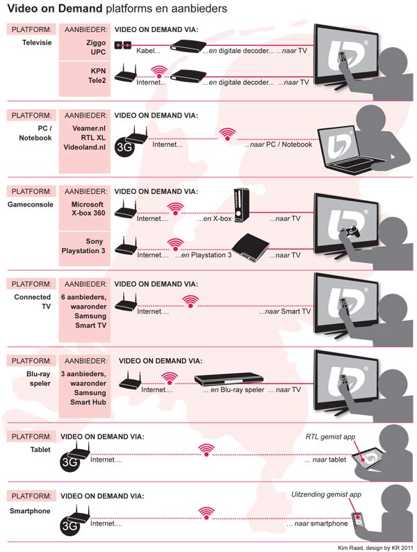 In onderstaande infographic wordt de verschillende Video on Demand kanalen duidelijk gemaakt. Je ziet de verschillende platformen en aanbieders.