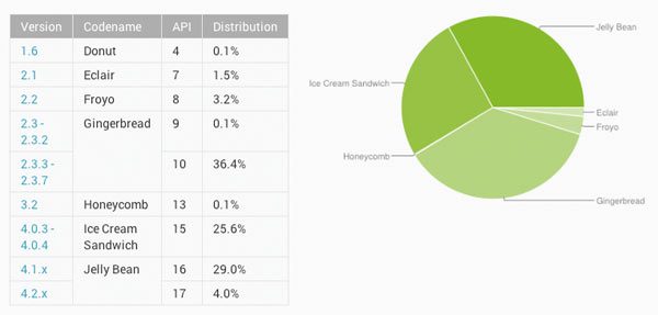 33 procent van de Android smartphones en tablets draait momenteel op Android 4.1 Jelly Bean of Android 4.2 Jelly Bean, zo blijkt uit nieuwe cijfers van Google. Vorige maand lag dit percentage nog op 28.4 procent. Het aandeel van het inmiddels verouderde Android 4.0 Ice Cream Sandwich is in een maand tijd gezakt van 27.5 procent naar 25.6 procent. Echter is Android 2.3 Gingerbread nog steeds de meest gebruikte versie met een aandeel van 37 procent. Deze versie is met name te vinden op goedkope smartphones.