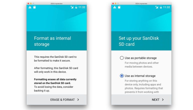 Daar komt met Android M verandering in want Google maakt het mogelijk om bij het formatteren van de microSD-kaart te kiezen uit ‘normaal draagbare opslag’ of ‘onderdeel van de interne opslag’. Wanneer je de laatstgenoemde optie kiest kun je voortaan apps en data kwijt op je microSD-kaart en breidt je het interne geheugen dus letterlijk uit. Enig nadeel is dat de kaart niet meer in andere apparaten gebruikt kan worden, tenzij deze weer geformatteerd wordt.