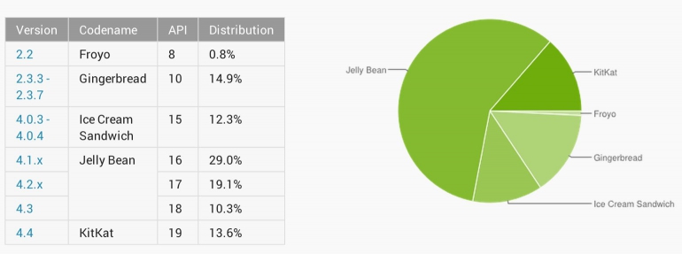 Hoewel KitKat gestaag groeit en inmiddels op bijna 14 procent van alle smartphones en tablets te vinden is, is Android Jelly Bean nog steeds het grootst. Deze versie, bestaande uit 4.1, 4.2 en 4.3, is te vinden op ongeveer 60 procent van alle toestellen. Op zich geen grote verrassing want er worden nog steeds veel tablets en smartphones met Android 4.2 of 4.3 uitgebracht.