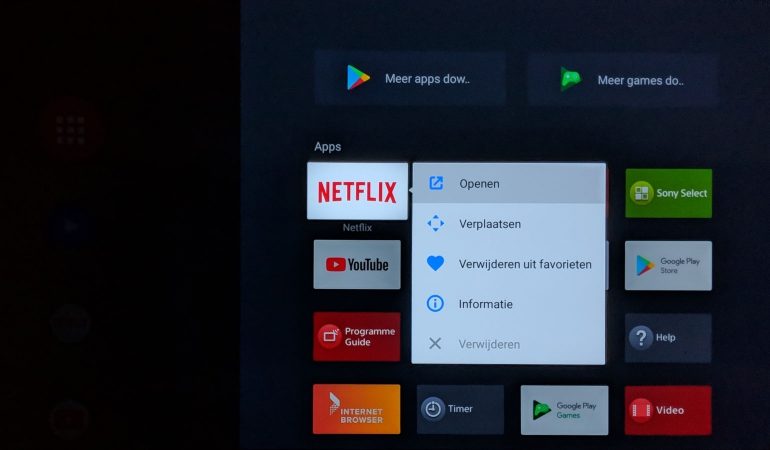 De apps nemen plaats bovenaan het scherm, de rij die je daar vindt, kan je beschouwen als je favorieten. Wil je alle geïnstalleerde apps zien, dan druk je lang op de ‘ok’ toets, of in het geval van Sony kan je ook op de Apps toets, rechts boven de d-pad, drukken.