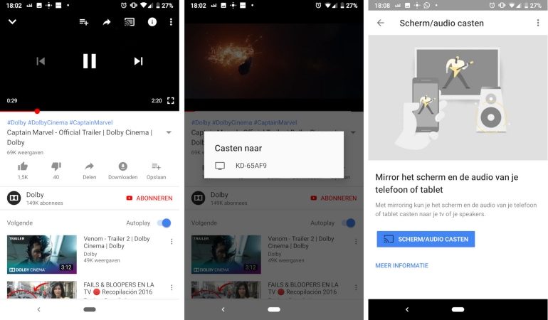 Een andere optie is het volledige smartphone scherm naar de televisie sturen (spiegelen of mirroren). Dat doe je het best vanuit de Google Home app, die vindt automatisch compatibele televisies op je netwerk. Je kunt ook mirroren via de Android instellingen op je smartphone maar helaas verstopt elke fabrikant dat op een andere plaats.