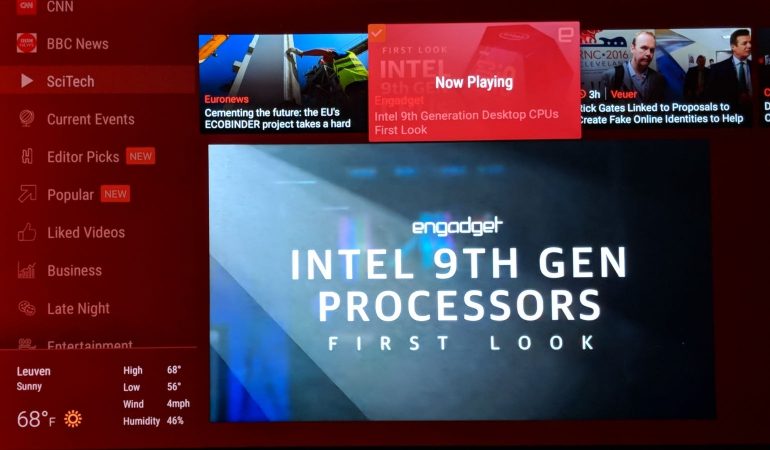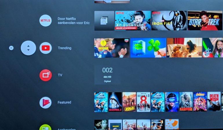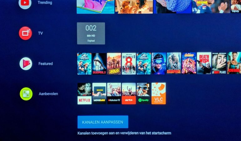 Als eerste rij vind je de lijst met apps, maar daaronder herwerkte Google de interface met het oog op ‘content-kanalen’, per toepassing. Dat kan bijvoorbeeld Netflix, YouTube of Spotify zijn, maar ook de ingebouwde tv-tuners. Theoretisch kan elke app die content aanbiedt daar verschijnen, maar de app moet dit uiteraard ondersteunen. Sommige apps bieden ook meerdere kanalen. Zo kan je bij YouTube bijvoorbeeld het Trending en/of het Aanbevolen kanaal installeren.