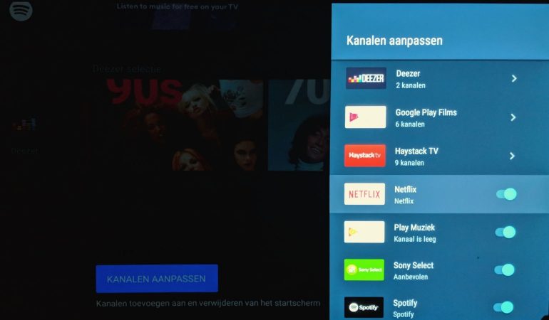 Om kanalen toe te voegen (of te verwijderen) klik je onderaan het startscherm op ‘kanalen aanpassen’. Je krijgt vervolgens een lijst met alle apps die een (of meerdere) kanalen bieden. Opgelet, sommige apps verschijnen pas in de lijst wanneer je ingelogd bent in deze app (bvb. Deezer), of nadat je ze een keer opgestart hebt.