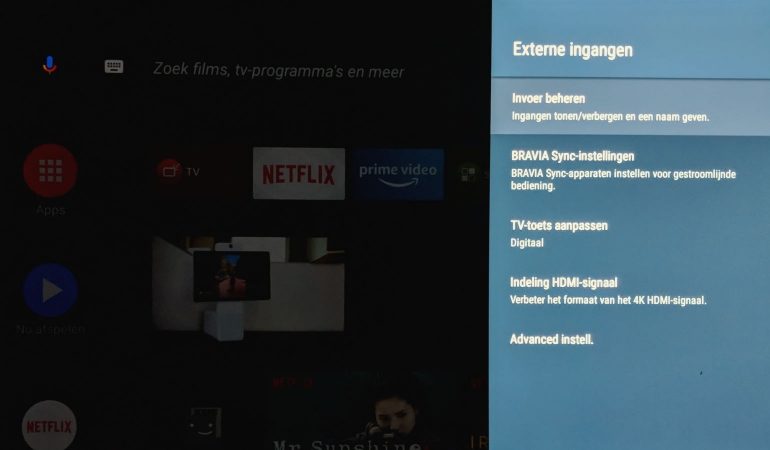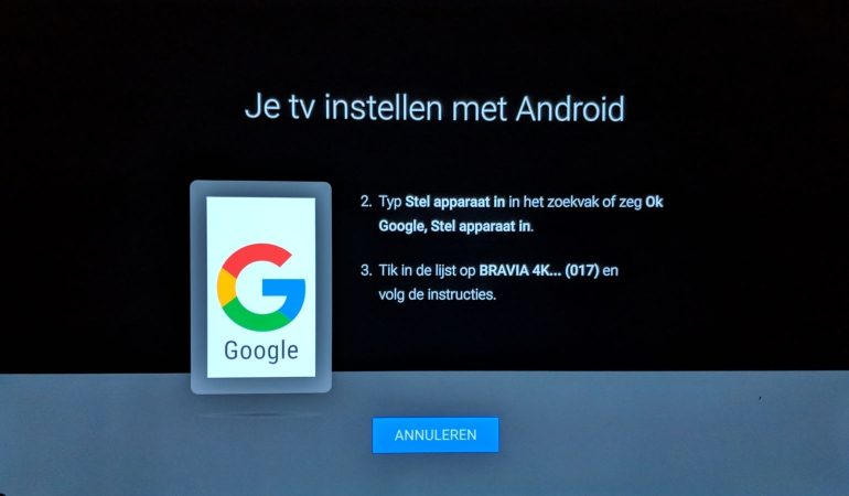 Onze gids is gebaseerd op een Sony KD-65AF9. Mochten er op andere merken/modellen afwijkende opties zijn, dan zullen we die in dit artikel aanvullen. De installatie van Android verloopt het handigst als je een Android smartphone bij de hand hebt. Het volstaat dan om via de Google App ‘Set up my Device’ uit te voeren.