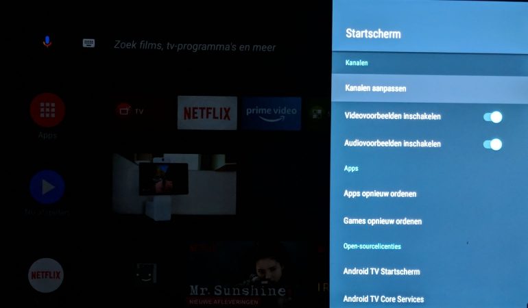 Android TV kreeg met versie 8 (Oreo) een volledig nieuwe interface. Het Home scherm vult nog steeds het volledig scherm, een keuze die we toch enigszins blijven betreuren. De lichtere aanpak van LG en Samsung, waarbij een groot deel van het beeld zichtbaar blijft heeft nog steeds onze voorkeur. Een voordeel van de nieuwe interface is dat de opdringerige rij aanbevelingen die bovenaan het scherm stonden verdwenen zijn.