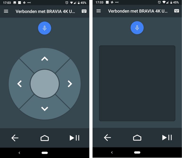 Een speciale vermelding voor de Android TV remote app. Hij is erg beperkt in functionaliteit, maar is best handig als je niet te veel gedoe wilt. De app biedt een d-pad en touchpad, met daarboven telkens een microfoon toets, en onderaan een toets voor Back, Home en Play/Pause.