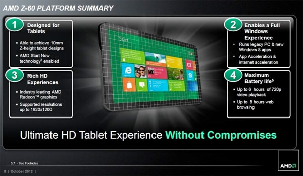 AMD heeft in een persbericht de belangrijkste voordelen en karakteristieken van de Z-60 chip beschreven. Interessant is dat de chipfabrikant beweert grafische prestaties te kunnen leveren die we nog niet eerder in tablets terugzagen. De chip moet volgens AMD 5 tot 6 keer betere grafische prestaties bieden dan de Ceder Trail processor van Intel, de voorganger van de Clover Trail chip. Via HDMI wordt er een resolutie van 1.920 bij 1.200 pixels ondersteund. Toch zitten er beperkingen aan want de fabrikant geeft aan dat bij het kijken van HD content en het spelen van games 720p een betere ervaring biedt dan 1080p.