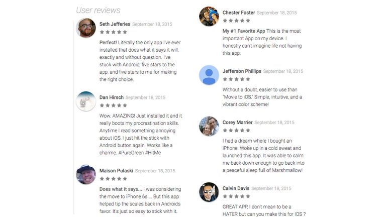 Wanneer je de app downloadt, dan krijg je de kans om direct op de knop: ‘click here to stick with Android’ te tappen. Doe je dat, dan krijg je het bericht dat het je is gelukt. Je hoeft deze app op geen enkele manier serieus te nemen en het is dan ook als grap bedoeld; maar als we kijken naar al die lovende recensies, dan weten we in elk geval dat de fanboy-oorlog nog lang niet voorbij is.