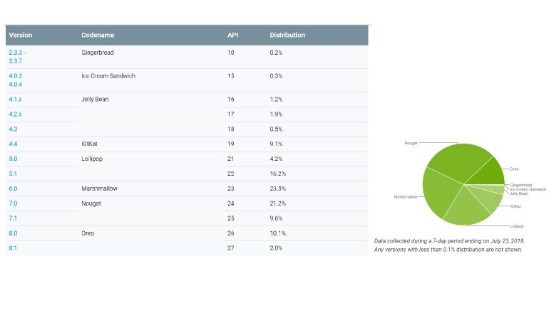 De cijfers van juli zijn gedurende een periode van 7 dagen bijgehouden tot 23 juli 2018. De cijfers laten zien welke versie van Android het meest gebruikt werd. Aangezien er geen cijfers van juni bekend zijn, gaan we de cijfers vergelijken met de distributiecijfers van de maand mei.