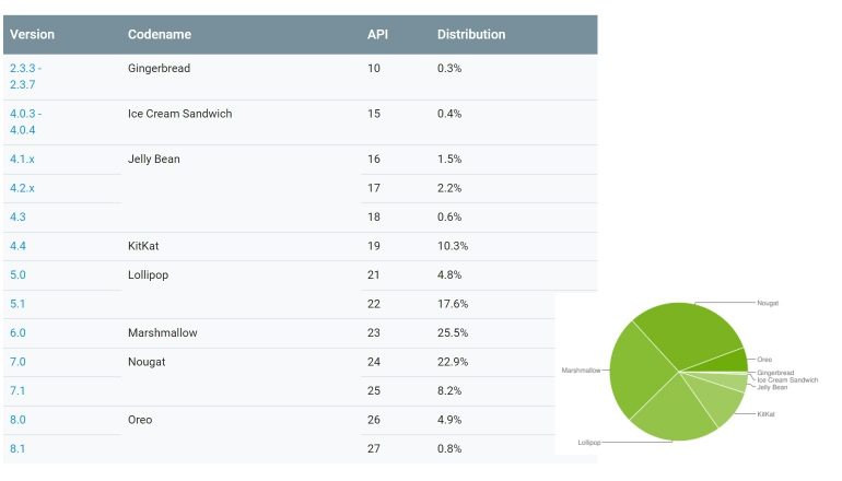 Het is grappig om te zien dat ook oude versies als Android Gingerbread (2.3.3 – 2.3.7) nog altijd gebruikt worden met een aandeel van 0,3%. Ook Android Ice Cream Sandwich (4.0.3 – 4.0.4) is nog altijd op 0.4% van de toestellen geïnstalleerd.