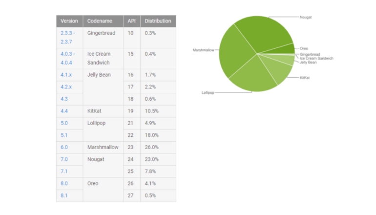 Ook het gebruikersaantal van Nougat neemt overigens nog toe. Gecombineerd is nu 30,8 procent van de apparaten voorzien van die versie van de software. Verder is er een lichte afname te zien bij andere versies van de software, bijvoorbeeld Jelly Bean, KitKat en Lollipop.