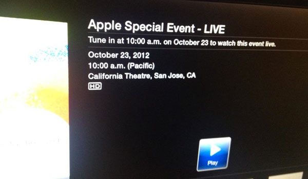 Voor het eerst lijkt het erop dat Apple een live stream aanbiedt, direct vanuit de zaal. Zover ik heb kunnen zien in de paar minuten dat ik dit weet kan het alleen via een Apple TV (2 en 3). Dit is natuurlijk vanaf nu met stip de beste manier om het nieuws te volgen, misschien in combinatie met een live-blogje voor de echte fans. Als je aTV nog geen logo met “Apple events” laat zien dan kan je hem even proberen te herbooten, bij mij verscheen het icoontje daarna links onderin.