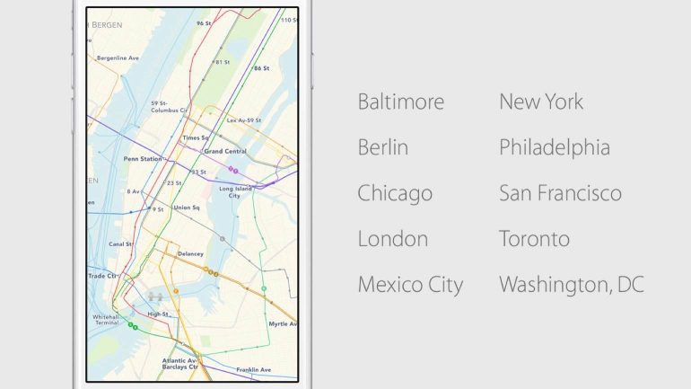 Maps is ook voorzien van een update maar deze is voor Nederlandse gebruikers nog niet bijzonder interessant. Apple heeft een speciale kaart gelanceerd voor het openbaar vervoer van een stad, met alle gedetailleerde informatie over routes, stations en lijnen. Vooralsnog zijn deze kaarten alleen beschikbaar in grote steden als Berlijn en New York. Daarbij krijgen retailers in maps die Apple Pay ondersteunen direct een logo waarmee dit aangeduid wordt.