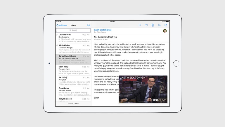Dat is nog niet alles want Apple brengt ook een picture-in-picture modus waarmee je een video, bijvoorbeeld bekeken via Netflix of de YouTube-app, als een klein venster over openstaande apps kunt leggen. Dit geldt ook voor bijvoorbeeld een videogesprek via FaceTime of Skype. De video wordt, wanneer er op getikt wordt, verkleind en is vervolgens middels je vingers over het scherm te schuiven. Zo kun je een e-mail tikken en tegelijkertijd een video bekijken. Deze functie komt naar de iPad Air, iPad Air 2, iPad mini 2 en iPad mini 3.