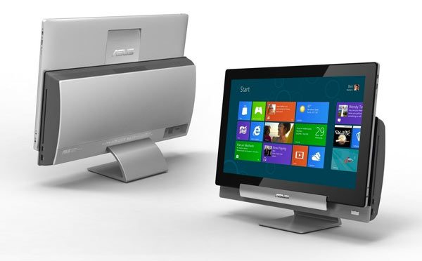 De ASUS Transformer All in One (AiO) kunnen we eigenlijk het minst al tablet bestempelen maar toch is het een ‘mobiel’ apparaat met touchscreen. In eerste instantie ziet dit product eruit als een desktop PC, maar zodra je het display uit het dock houdt hou je in principe een grote tablet over. Er zit wel en nadeel aan want eigenlijk gaat het om een draadloos display dan nog steeds moet communiceren met het dock. Je kunt deze 18.4 inch tablet dus niet overal mee naar toe nemen. Daarnaast kun je zowel Windows 8 als Android op deze computer draaien en het schakelen tussen deze twee besturingssystemen kan middels een simpele druk op de knop.