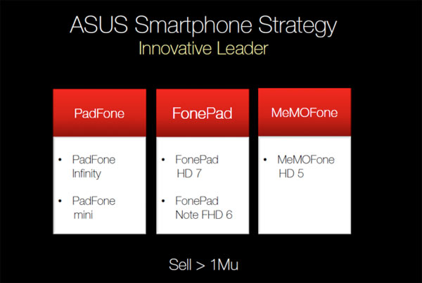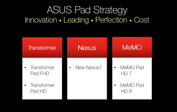 ASUS heeft afgelopen februari tijdens het Mobile World Congress in Barcelona een aantal nieuwe tablets gelanceerd, waaronder de FonePad, de MeMO Pad 7 en de MeMO Pad Smart 10. Deze laatste twee tablets werden tijdens Computex 2013, een beurs die in juni plaatsvond, alweer opgevolgd door de MeMO Pad HD 7 en MeMO Pad FHD 10. Daarbij presenteerde ASUS onder meer de Transformer Pad Infinity 2013 en de FonePad Note FHD 6.