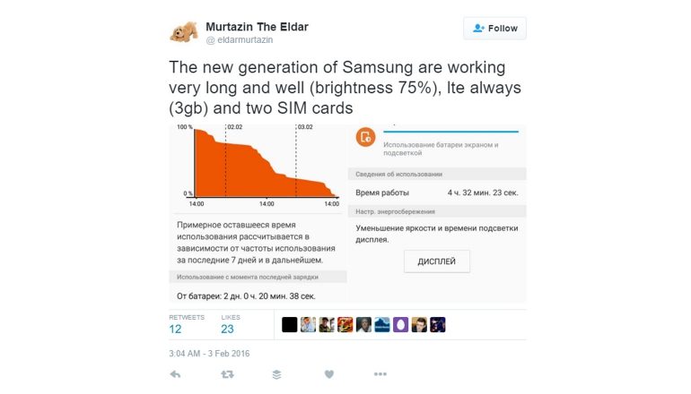 Naar verluidt zal de Samsung Galaxy S7 zo’n 48 uur (of iets langer) meegaan op een volle batterij, wanneer het toestel niet vaak gebruikt wordt. Dat is nogal een stretch, omdat smartphones en phablets juist wel vaak gebruikt worden – maar het is in elk geval goed om te weten dat de batterij lang goed blijft bij weinig gebruik. Mogelijk krijgt de Samsung Galaxy S7 een batterij van 3000mAh en dat moet voor genoeg energie zorgen deze twee dagen (waar het scherm vier tot vijf uur is aan geweest). Dat blijkt uit de onderstaande tweet.