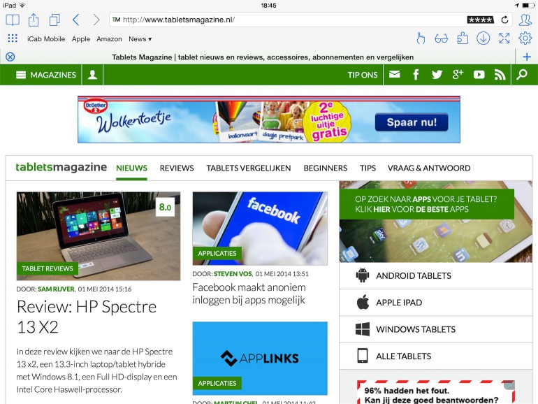 iCab is ondanks de vele mogelijkheden heel licht en daardoor ook snel, je zult niet veel langer op een website wachten als wanneer je Safari gebruikt. iCab biedt ook uitgebreide gestures. Je kunt per website een gesture bedenken. Bij het tekenen van een ‘T’ zou je bijvoorbeeld in kunnen instellen dat de browser naar Tabletsmagazine gaat. Het switchen van tabbladen gaat net zoals bij Safari, ze worden bovenaan weergegeven. iCab heeft ook ook hele uitgebreide privacy features. Je kunt niet alleen je geschiedenis verwijderen, maar uitschakelen dat websites je volgen.