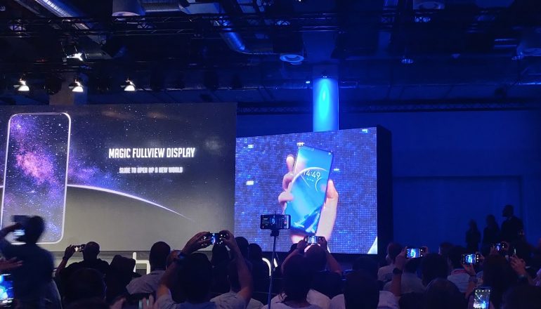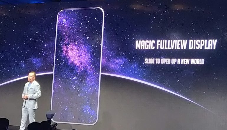 Opvallend aan de telefoon is vooral het scherm aan de voorkant. Dat bevat geen notch, waarmee de Huawei-dochter voor het eerst een full-screen telefoon op de markt brengt. Dat is mogelijk door de selfiecamera achter het scherm te verbergen. Door aan de achterkant een schuifje omhoog te duwen, komen de camera en speaker tevoorschijn.