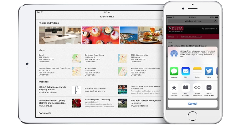 Elke app die het share-sheet ondersteunt, kan nu ook als bijlage gelinkt worden. Door op het deel-icoon te tikken in een app, en vervolgens op het icoon van de notities app, voeg je een link toe. Zo kun je bijvoorbeeld een link van een website toevoegen aan een notitie vanuit Safari, maar je kunt ook een Pages-document linken of een plaats op de kaart uit de Kaarten-app.