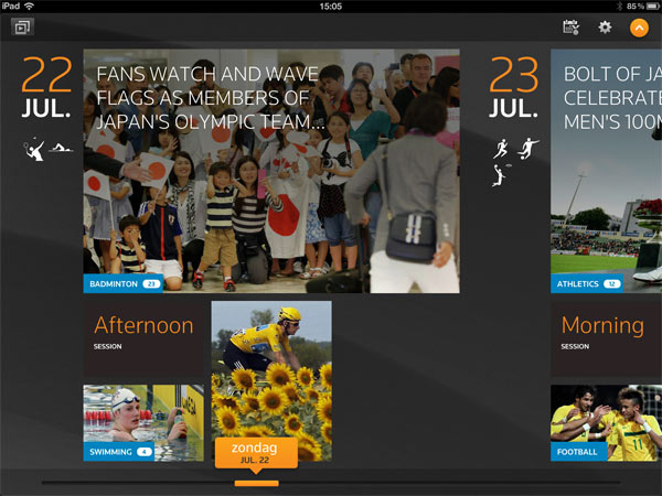 De app is vooral een soort timeline waar je in kan scrollen om per dag foto’s en nieuws te bekijken. Ik vind vooral de slideshow functie erg cool om de komende weken als achtergrond op mijn bureau te hebben staan waar alle foto’s langzaam aan me voorbij trekken. Natuurlijk is ook in deze app weer wat informatie te vinden over de behaalde medailles, de schema’s en worden er achtergronden geschreven met populaire deelnemers als onderwerp.