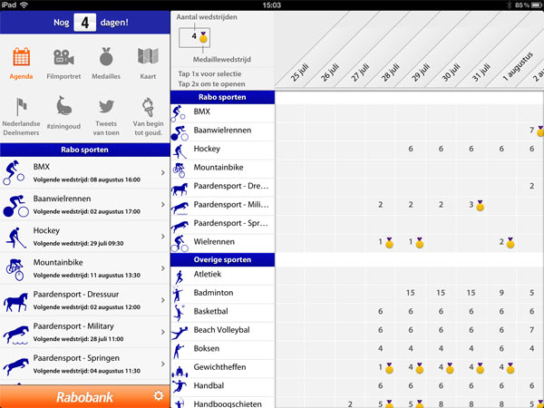 Rabobank heeft in mijn ervaring vaak de beste app als het gaat om sportevenementen waar ze als sponsor zelf ook wat mee te maken hebben. In dit geval is dat niet anders. De Rabobank Zin in Goud app is een prima applicatie die zowel voor Android als iOS gratis te downloaden is. Vooral gericht op de Nederlandse sporters en met wat extra aandacht voor de sporten die door Rabobank gesponsord zijn. Nieuwsberichten, foto’s, schema en nog veel meer zijn allemaal in de app te vinden. Via een speciale hashtag kun je vanuit de app (Twitter) ook je ervaringen en succeswensen delen met de rest van Nederland, en de Nederlandse sporters. Ook de video items die geproduceerd worden zijn erg interessant en als je maar ruimte heb voor één app op je tablet dan denk ik dat deze App de beste keus is.