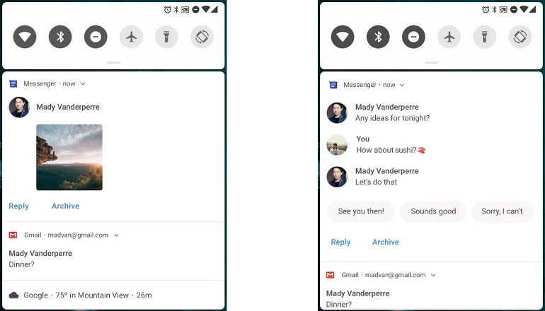 Daarnaast heeft Google het snelle menu en de notificatielade aangepast. De hoeken van deze schermen zijn nu ronder gemaakt. Het gaat hier om kleine tweaks die later nog kunnen veranderen; maar opvallend is het in elk geval. Of het ook daadwerkelijk beter is, mag je zelf beslissen. Ook kun je nu meer van het gesprek in de notificatie lezen en kun je direct antwoorden met slimme replieken, stickers en meer. Onduidelijk is nog of de apps hiervoor ondersteuning moeten inbouwen of dat alle applicaties er meteen mee overweg kunnen.